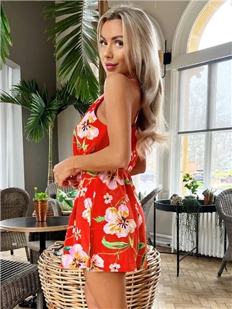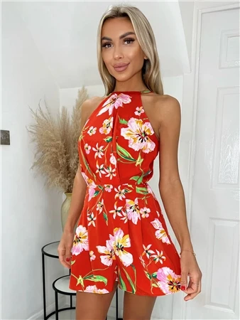 This Orange Floral High Neck Playsuit is an essential wardrobe staple this season! Featuring a high neck, floaty shorts and a zip up back. Super comfy yet flattering fit. Dress it up with some heels and jewellery, or dress down with flat sandals!
