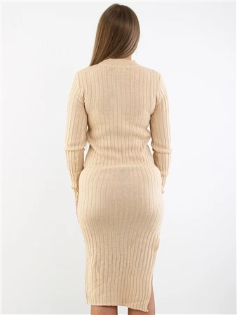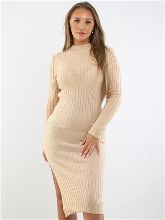 Brave Soul Biscuit Ribbed Long Sleeve Split Hem Midi Jumper Dress