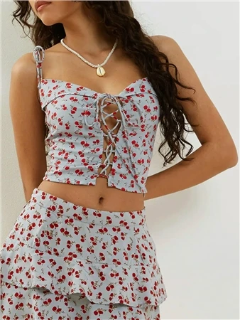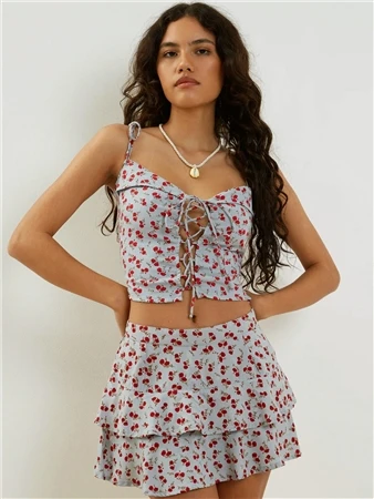 In a red and blue floral print, our Kalilo top features a cropped fit, thin cami straps and lace up front detailing. Pair with our Lowisa mini skirt