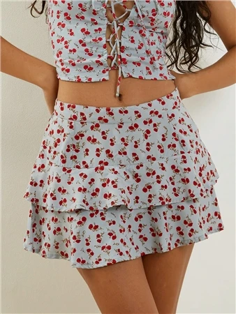The must-have skirt of the summer. The Lowisa features a mini length, ruffle hemline and a blue and red floral print. Style with our Citra top for a co-ordinated look