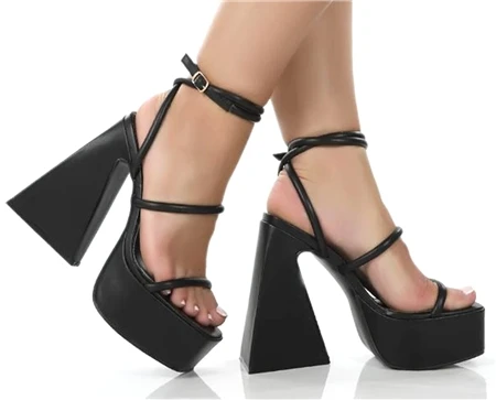 Public Desire Black Pu Square Toe Strappy Platform Flared Heels