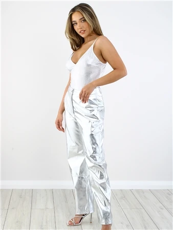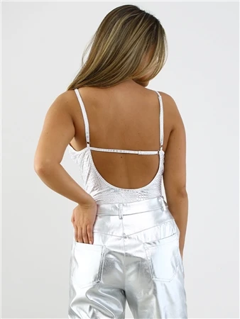 Saint Genies Silver Metallic Snake Stretch Satin Thong Bodysuit